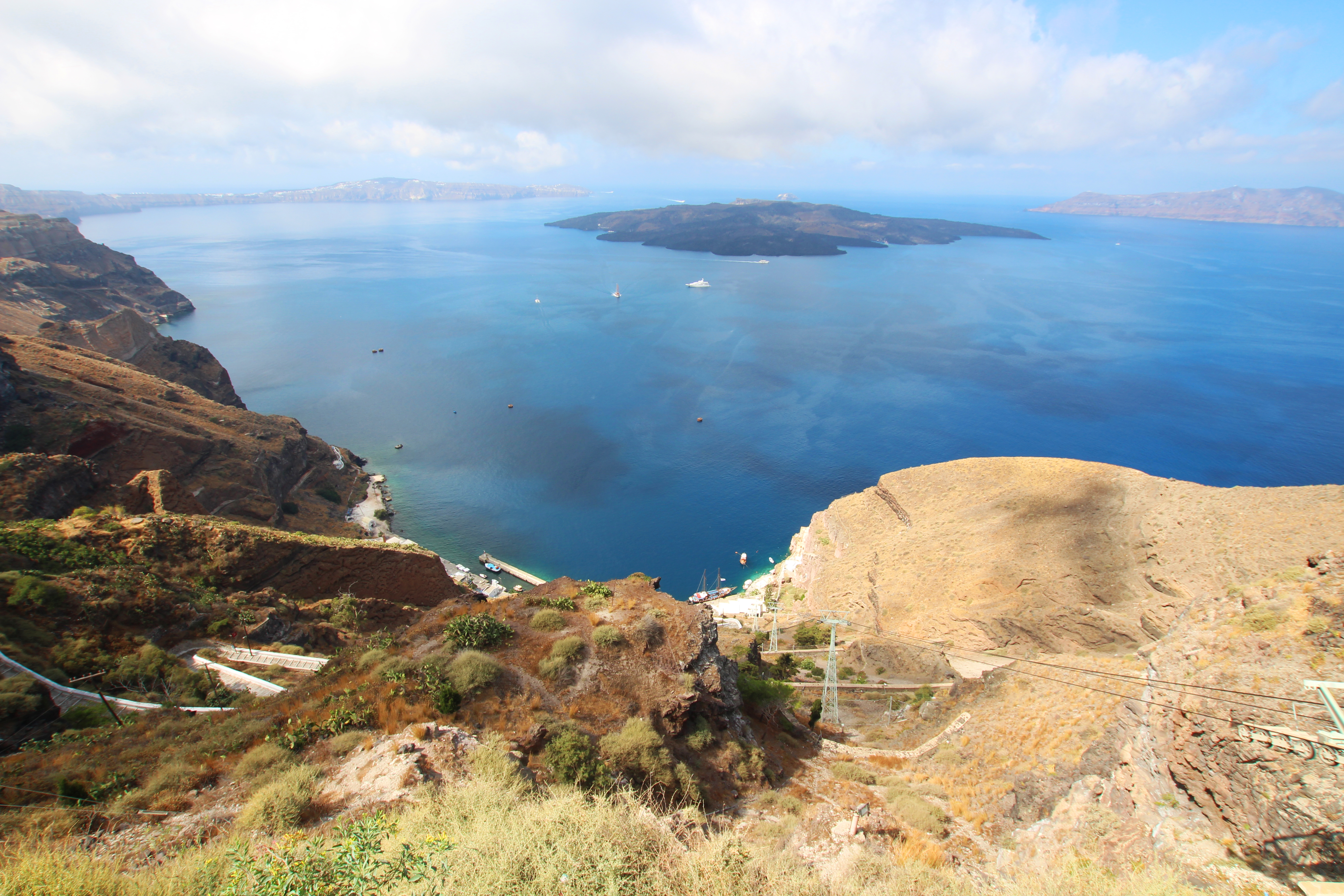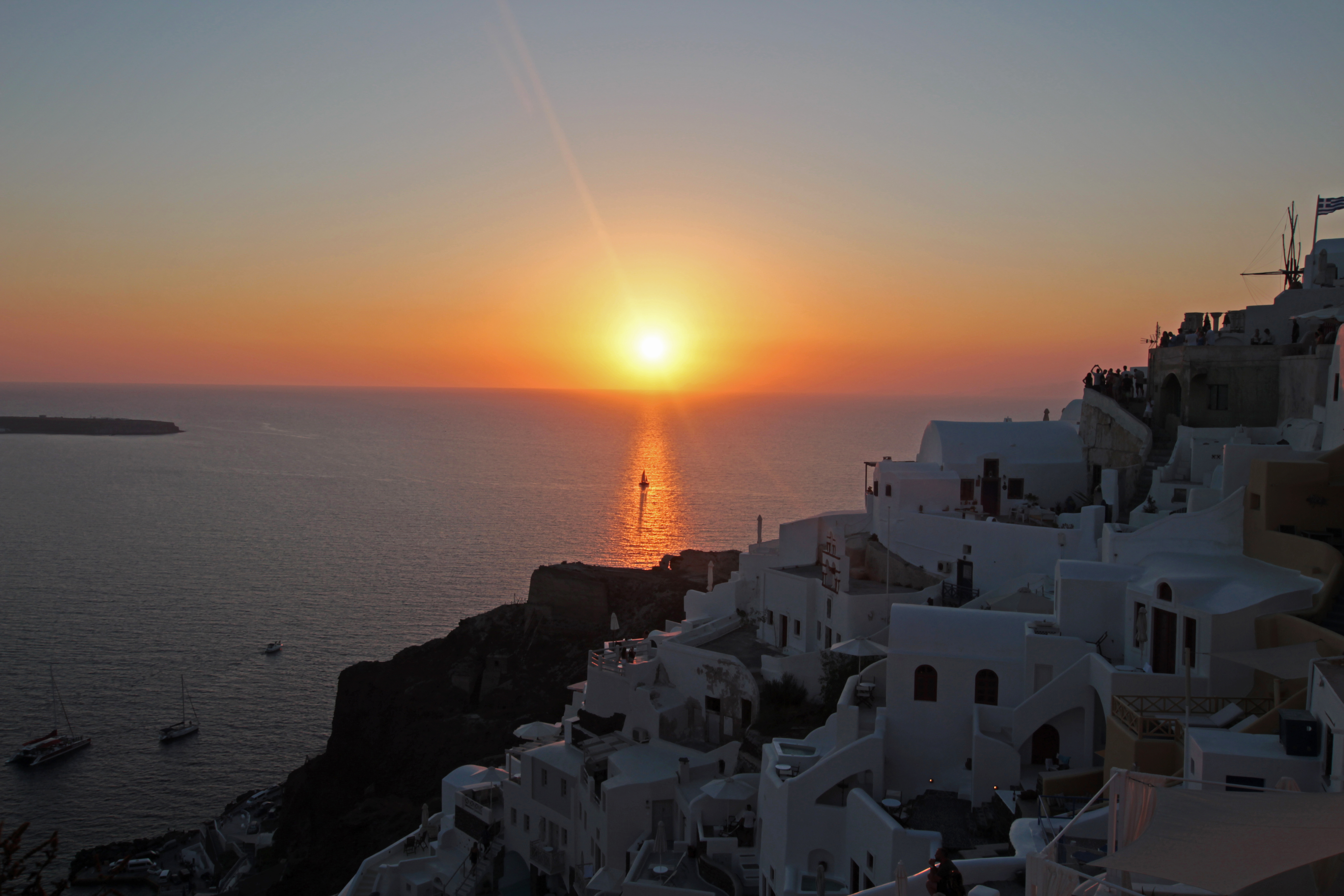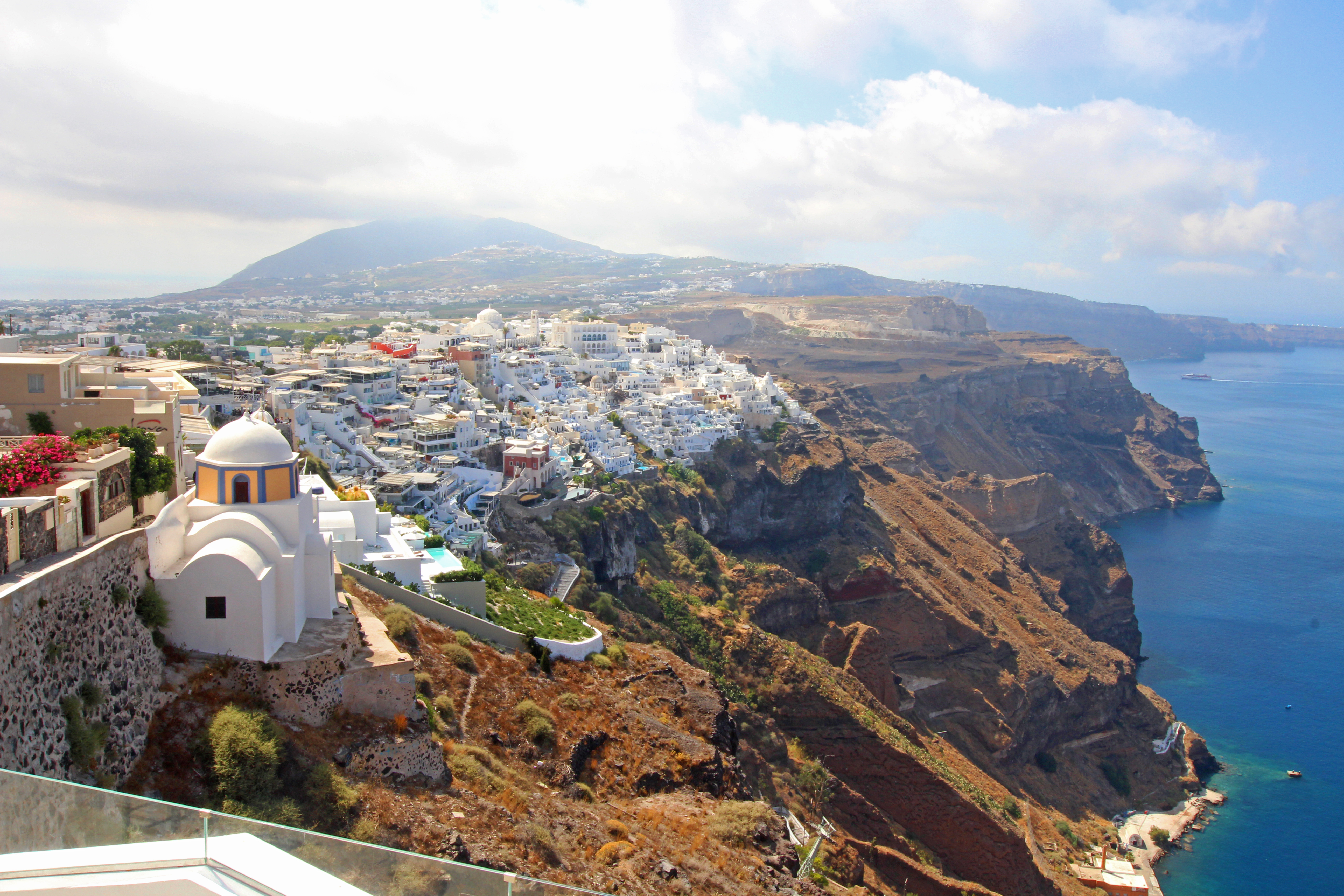The other side is vast and flat, with beaches featuring sand the colour of charcoal – Santorini and the surrounding islands are the remnants of a volcanic caldera.